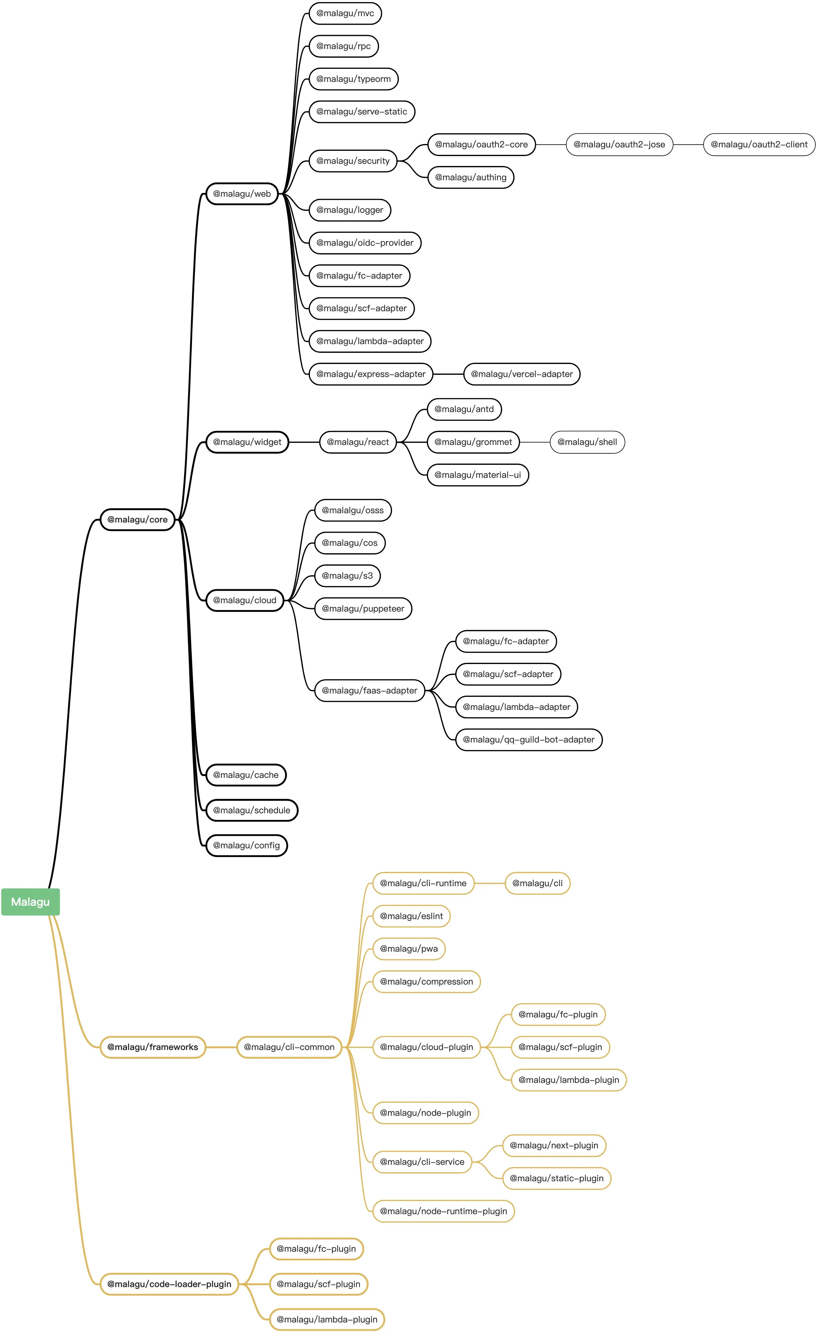 @celljs/core: 核心组件,包含了依赖注入、日志、数据验证等核心能力@celljs/web:Web 组件,包含了 Web 应用核心逻辑的抽象@celljs/mvc:MVC 组件,提供了基于装饰器的 REST 风格 Web API 定义方式@celljs/rpc:RPC 组件,提供了基于装饰器的 RPC 风格 Web API 定义方式@celljs/cache缓存管理组件,基于cache-manager模块实现的缓存管理组件,默认提供内存存储策略,我们也能很方便的使用其他存储策略,如 redis、mongodb、memcached 等等@celljs/schedule: 任务调度组件,提供了基于 Cron 的定时任务调度能力,支持部署 Serverless 平台@celljs/typeorm: 数据库组件,提供了基于 TypeORM 的简化数据库操作相关封装@celljs/security: 安全组件,提供了认证与授权核心逻辑的抽象@celljs/serve-static: 静态资源服务组件,提供了开箱即用的静态资源服务能力@celljs/logger: 日志组件,提供了基于 pino 的高级日志能力@celljs/oidc-provider:OIDC 提供者组件,提供了快速自建 OIDC Provider 服务能力@celljs/fc-adapter: 阿里云函数计算适配器组件,提供了部署到函数计算平台上的能力@celljs/scf-adapter腾讯云函数适配器组件,提供了部署到云函数平台上的能力@celljs/lambda-adapteraws lambda 适配器组件,提供了部署到 lambda 平台上的能力@celljs/vercel-adapterVercel 平台适配器组件,提供了部署到 Vercel 平台上的能力@celljs/express-adapterExpress 适配器组件,提供了部署到传统服务器上的能力@celljs/oauth2-core:OAuth2.0 核心组件,提供了基于 OAuth2.0 授权与 OIDC 认证核心逻辑抽象@celljs/oauth2-joseOAuth2.0 JOSE 组件,提供了对 JOSE 框架的支持@celljs/oauth2-client:OAuth2 客户端组件,提供了 OAuth2.0 授权和 OIDC 认证的客户端能力@celljs/authingAuthing 集成组件,提供了基于 Authing 平台认证与授权的客户端能力@celljs/widget前端 Widget 组件,提供了前端主题、国际化、Widget 等等核心逻辑抽象@celljs/react:React 集成组件,提供了对 React 前端框架的集成,零配置、可扩展和装饰器风格的路由配置能力@celljs/antd:Antd 集成组件,提供了 Antd 前端框架开箱即用的能力@celljs/grommetGrommet 集成组件,提供了 Grommet 前端框架开箱即用的能力@celljs/material-uiMaterial UI 集成组件,提供了 Material UI 前端框架开箱即用的能力@celljs/shellShell 组件,提供了可扩展、开箱即用的主框架页面@celljs/cloud云基础组件,提供多云抽象,屏蔽不同云厂商的云服务底层差异@celljs/oss阿里云 oss 服务组件,提供对象存储服务相关操作的实现@celljs/cos腾讯云 cos 服务组件,提供对象存储服务相关操作的实现@celljs/s3亚马逊云 s3 服务组件,提供对象存储服务相关操作的实现@celljs/puppeteer:Puppeteer 集成组件,基于对象存储服务实现 Puppeteer 的集成@celljs/config: 配置组件,提供运行时组件属性配置能力@celljs/eslint: 代码风格检查插件@celljs/pwa:PWA 插件@celljs/compression: 前端静态文件压缩插件@celljs/cloud-plugin: 云厂商基础插件,提供了关于云厂商的通用能力,比如支持 AKSK 等参数的配置和查看功能@celljs/code-loader-plugin: 代码加载插件,提供了对编译后的代码通用加载能力@celljs/fc-plugin: 阿里云函数计算插件,集成阿里云函数计算,提供部署、查看等能力@celljs/lambda-plugin: AWS Lambda 插件,集成 AWS Lambda,提供部署、查看等能力@celljs/next-plugin: Next.js 插件,提供 Next.js 框架项目的构建能力,让 Next.js 也能使用 Cell.js CLI 进行部署,目前支持阿里云函数计算、腾讯云函数@celljs/node-plugin: Node.js 插件,提供 Node.js 项目通用构建能力。@celljs/node-runtime-plugin: Node.js 运行时插件,提供自定义 Node.js 运行时能力@celljs/scf-plugin: 腾讯云函数插件,集成腾讯云函数,提供部署、查看等能力@celljs/static-plugin: 静态网站插件,提供静态网站项目通用构建能力,Cell.js 支持 React、Vue、angular 等等前端项目一键部署能力,是通过静态网站插件完成@celljs/cli-service: 命令行服务插件,提供了 Node.js 后端和前端统一的运行、构建能力,以及通用部署抽象
